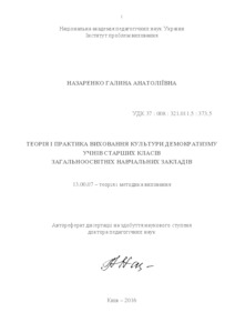 - Назаренко, Г.А. (2016) Theory and Practice of Educating Democracy Culture in Comprehensive School Senior Students Other thesis, Інститут проблем виховання.