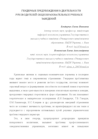 - Нежинська, О.О. (orcid.org/0000-0002-0800-356X) and Бондарчук, О.І. (2013) Gender prejudices are in activity of heads of general educational establishments Актуальные вопросы педагогики и психологии, 2. pp. 88-92.