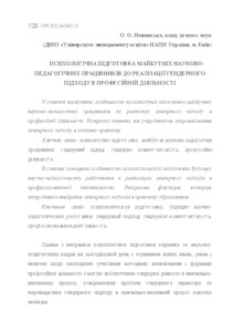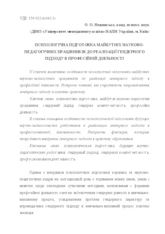 - Нежинська, О.О. (orcid.org/0000-0002-0800-356X) (2013) Psychological preparation of future scientifically-pedagogical workers is to realization of gender approach in professional activity Психолого-педагогічне забезпечення особистісного розвитку майбутнього фахівця з вищою освітою. pp. 126-133.