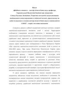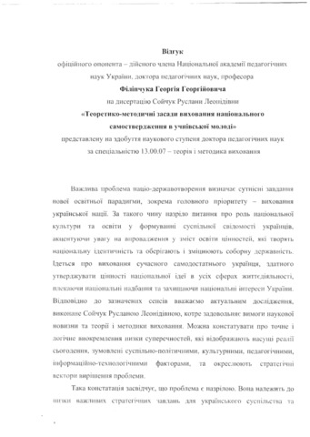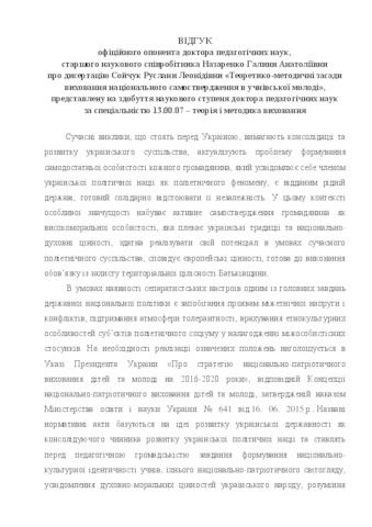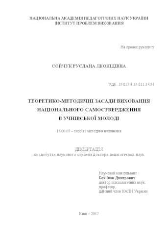 The thesis represents a new conceptual approach to education of national selfassertion in school youth that consists of substantiation of the theoretical and methodical bases of formation of national self-assertion in school students, development and experimental testing of the efficiency of the structural-functional model and methods of educating school youth’s national self-assertion in extracurricular activities of general educational institution. The author substantiates theoretical and methodological approaches to studying the issue of national self-assertion of personality. She specifies the content of the notion ‘national self-assertion of personality’ as an integrative quality-value of a person that manifests itself as a formed positive national identity through which the person realizes his (her) civic position. The candidate for the degree argues that this quality-value covers love towards Homeland, responsibility for the nation and respect towards all ethnical groups that constitute the Ukrainian people, aspiration for moral self-perfection, readiness to protect the Ukrainian state’s national interests.