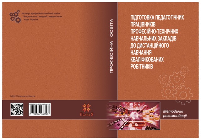 he methodical recommendations cover the theoretical aspects of the training of pedagogical workers of vocational schools before the implementation of distance learning of skilled workers. The technology of developing electronic content for its use in the system of distance learning, the means of controlling the success of skilled workers in the distance learning process is presented and the peculiarities of the organization of independent work of skilled workers by means of distance learning are revealed. Methodical recommendations are addressed to managers and teachers of vocational schools, post-graduate students and doctoral students, students and teachers of institutes of postgraduate education, methodologists of scientific (educational) -methodic centers of vocational education.