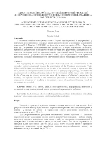 - Дічек, Наталія Петрівна (2017) Achivments of Ukrainian Pedagogical psychology in implementing a differetiated approach to the secondary school education: the heritadge of YU.Z. Gilbukh (1928-2000) Vzdelávanie a spoločnosť: Postup medzinárodnej konferencie, 2. pp. 62-70.