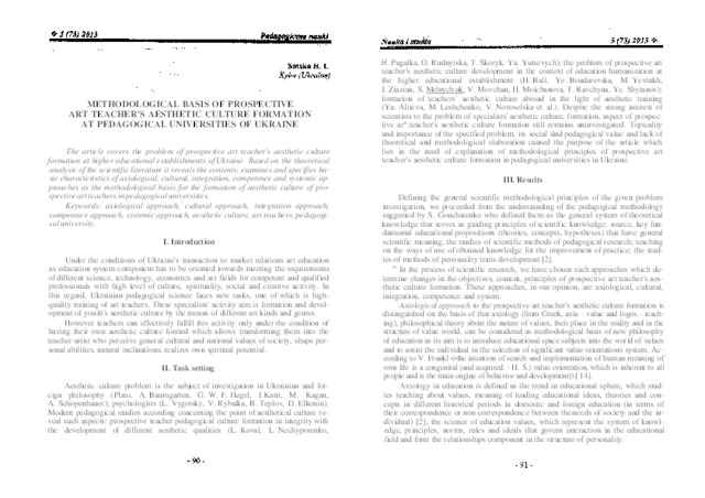 - Sotskaya, Galina (orcid.org/0000-0002-0184-2715) (2013) Methodological basis of prospective art teacher's aesthetic culture formation at pedagogical universities of Ukraine Nauka i Studia (73). pp. 90-99. ISSN 1561-6894
