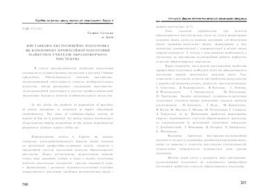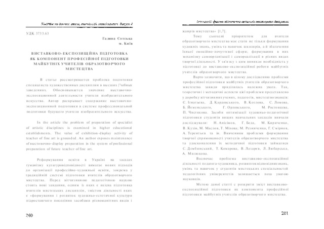 - Сотська, Г.І. (orcid.org/0000-0002-0184-2715) (2009) Exposition training as a component of the professional training of future teachers of fine arts Мистецька освіта: зміст, технології, менеджмент (4). pp. 200-206.