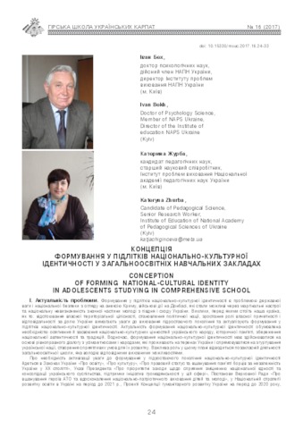 - Бех, І.Д. (orcid.org/0000-0002-4763-1673) and Журба, Катерина Олександрівна (orcid.org/0000-0002-3854-4033) (2017) Сonception of forming national-cultural identity in adolescents studying in comprehensive school Гірська школа Українських Карпат, 16. pp. 24-33. ISSN 1994-4845