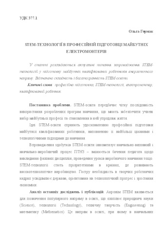 - Гермак, Ольга Леонідівна (2017) STEM-technology in the professional training of future electricians Наукові записки Малої академії наук України. Серія: педагогічні науки (9). pp. 86-91. ISSN 978-966-2633-85-6