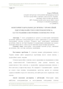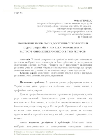 - Гермак, Ольга Леонідівна (orcid.org/0000-0002-0739-2794) (2016) Monitoring of educational achievements in the training of future electricians with application electronic educational resources Адаптивне управління: теорія і практика. Серія "Педагогіка", 1 (1).