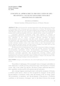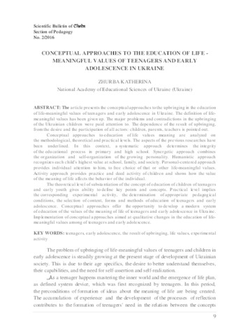 - Zhurba, Katherina (orcid.org/0000-0002-3854-4033) (2016) Conceptual approaches to the education of life-meaningful values of teenagers and early adolescence in Ukraine Scientific Bulletin of Chełm - Section of Pedagogy, 2. pp. 9-14. ISSN 2084-6770