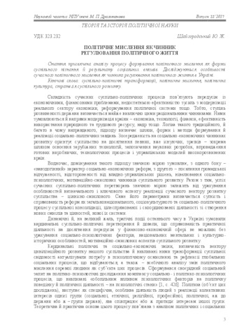 - Шайгородський, Ю.Ж. (2017) Political Thinking As A Factor Regulation Of Political Life Науковий часопис Національного педагогічного університету імені М. П. Драгоманова. Серія 22. Політичні науки та методика викладання соціально-політичних дисциплін (22). pp. 3-15. ISSN 2411-1287