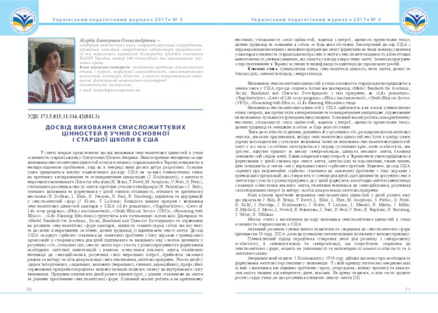 - Журба, Катерина Олександрівна (orcid.org/0000-0002-3854-4033) (2017) Experience of raising meaning of life velues in secondary and high school students in the USA Український педагогічний журнал, 3. pp. 70-79. ISSN 2411-1317