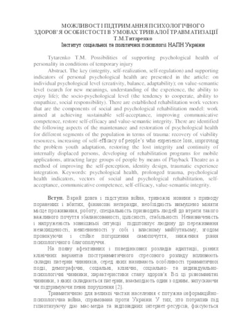 МОЖЛИВОСТІ ПІДТРИМАННЯ ПСИХОЛОГІЧНОГО ЗДОРОВ’Я ОСОБИСТОСТІ В УМОВАХ ТРИВАЛОЇ ТРАВМАТИЗАЦІЇ.pdf - Published Version Download (563kB) | Preview |