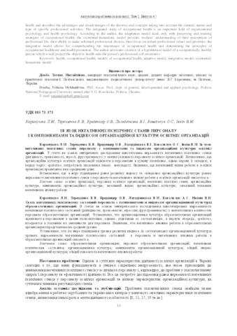 - Карамушка, Л.М., Терещенко, К.В., Креденцер, О.В., Лагодзінська, В.І., Ковальчук, О.С. and Івкін, В.М. (2017) Relationship between teaching staff's negative mental states and educational organization culture components and index Актуальні проблеми психології. Том І. Організаційна психологія. Економічна психологія. Соціальна психологія, 47. pp. 14-22. ISSN 2072-4772