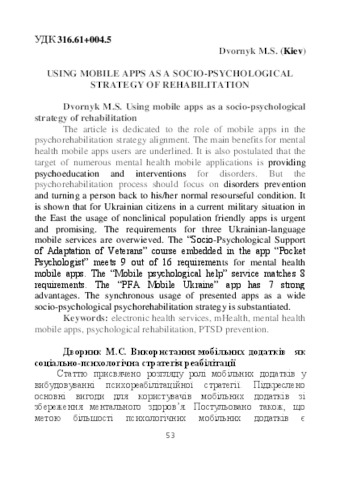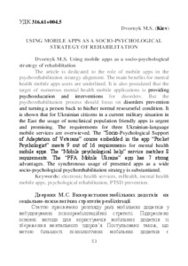 - Dvornyk, Marina (orcid.org/0000-0003-1505-0169) (2017) Using mobile apps as a socio-psychological strategy of rehabilitation Психологічні науки: проблеми і здобутки (10). pp. 53-67. ISSN 2522-4093