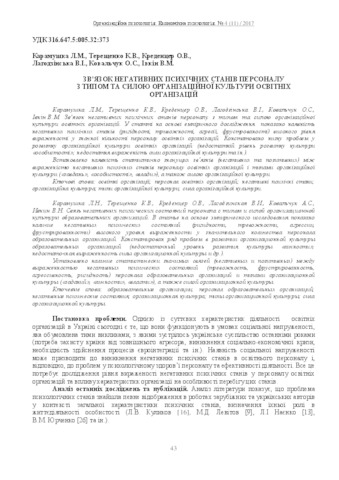 - Карамушка, Л.М., Терещенко, К.В., Креденцер, О.В., Лагодзінська, В.І., Ковальчук, О.С. and Івкін, В.М. (2017) Relationship between educational organization staff's negative mental states and types and levels of educational organization culture Організаційна психологія. Економічна психологія, 4 (11). pp. 43-53. ISSN 2411–3190