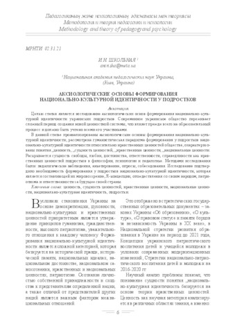 - Шкільна, Ірина Миколаївна (orcid.org/0000-0001-9456-8278) (2017) Axiological foundations of the formation of national and cultural identity in teenagers Педагогика и психология, 4 (33). pp. 6-13.