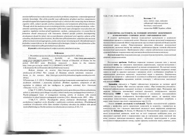 - Костенко, Т.М. (orcid.org/0000-0002-4976-1236) (2017) Psychological continuity as the major priority of continuous psychological follow-up for children with visual impairments Освіта осіб з особливими потребами: шляхи розбудови (12). pp. 167-174. ISSN 2313-4011
