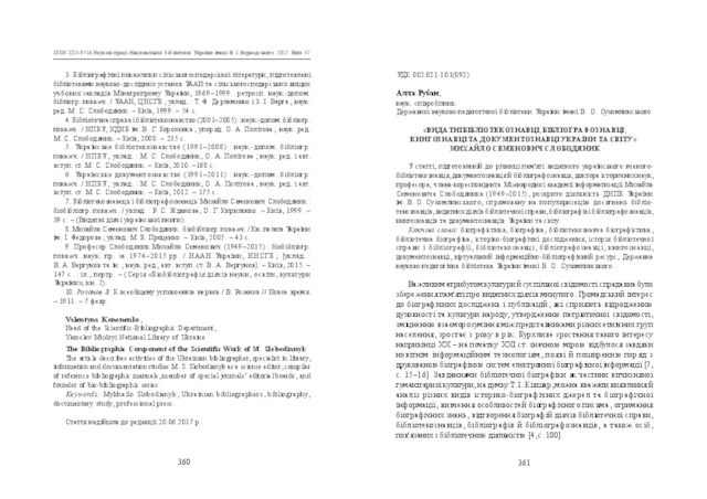 - Рубан, Алла Іванівна (2017) Outstanding Librarians, Bibliographers, Bibliologists and Documentalists of Ukraine and the World: Mykhailo Semenovych Slobodianyk Наукові праці Національної бібліотеки України імені В. І. Вернадського, 47. pp. 361-371. ISSN 2224-9524