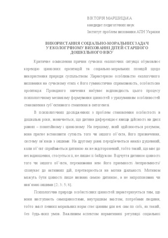 - Маршицька, В.В. (orcid.org/0000-0002-7072-8844) (2003) Use of social and moral tasks in the ecological upbringing of children of the senior preschool age Дошкільне виховання, 11. pp. 7-10.