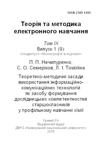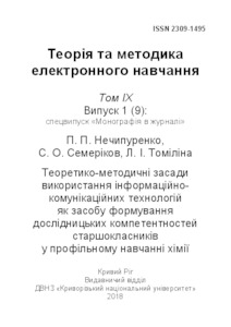 The special issue contains a monograph by P. P. Nechypurenko, S. O. Semerikov, L. I. Tomilina, in which the system of senior pupils’ research competencies in the chemistry profile learning is designed, the model of formation of senior pupils’ research competencies in the chemistry profile learning using ICT is theoretically grounded and the methodic of using information and communication technologies as tools of forming the senior pupils’ research competencies in the chemistry profile learning is developed. For scientists, lecturers and students of higher education institutions, school teachers, post-graduate students and all those interested in modern theory and methods of ICT use in education.