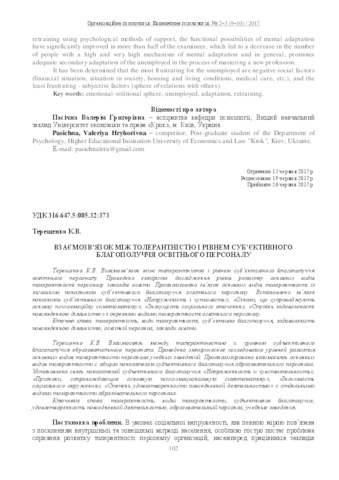 - Терещенко, К.В. (2017) The relationship between teaching staff’s tolerance and their subjective well-being Організаційна психологія. Економічна психологія, 2-3 (9-10). pp. 102-108. ISSN 2411–3190