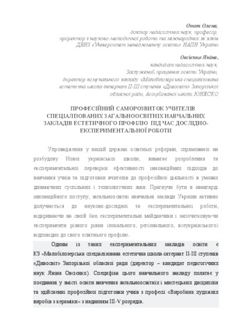 - Отич, О.М. and Овсієнко, Я.М. (2017) Professional self-development of teachers of specialized general educational institutions of aesthetic profile during experimental work Рідна школа, 9-10 (1053-1). pp. 85-89. ISSN 0131-6788