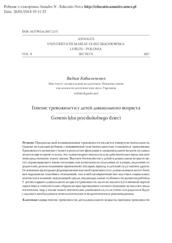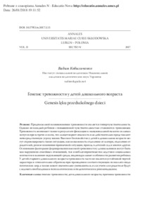 - Кобильченко, В.В. (orcid.org/0000-0002-7717-5090) (2017) Genesis of anxiety in preschool children Annales Universitatis Mariae Curie-Sklodowska. Sectio N – Educatio Nova (2). pp. 15-26. ISSN 2451-0491; e-ISSN: 2543-9340