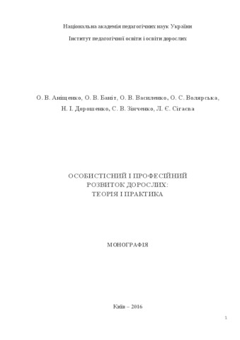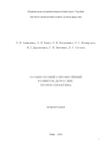 The monograph covers the theoretical and practical aspects of personal and professional development of adult learners in continuing education, namely: Potential of continuous education for personality and professional development of adults, feature of studies of adults in the system of informal education on the basis of exprence of the English-language countries, psychological principles of personality development of adults, psychological, pedagogical principles of professional development of personnel in theconditions of corporate studies and preparation. Considerable attention is paid to the characterization of the didactic principles of personal and professional development of the unemployed in the process of retraining, as well as the professional development of adults in postgraduate pedagogical education. The monograph is intended for teachers and students of higher educational establishments, institutions of vocational education, students of institutions of postgraduate education, scientists, postgraduates and doctoral students who study the problems of adult education.