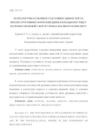 - Кравчук, С.Л. (orcid.org/0000-0002-6951-1912) (2017) The psychological peculiarities of spiritual values and nonconstructive forms of behavior in youthful age in the political-legal sphere in the conditions of military conflict Науковий вісник Херсонського державного університету, 1 (3). pp. 104-108. ISSN 2312-3206