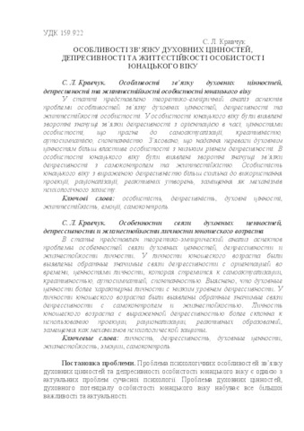 - Кравчук, С.Л. (orcid.org/0000-0002-6951-1912) (2017) Peculiarities of connection of spiritual values, depression and hardiness of personality of youth age Актуальні проблеми психології, 30 (10). pp. 129-139. ISSN 2072-4772