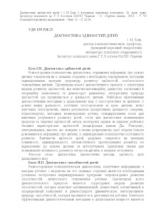 Versatile psychological diagnosis, information about each child with a focus on its strengths are essential to building individual programs to support the development of skills, personal development of the child. A reference point of all the diagnostic process is the structural model of the development of abilities, that includes motivational, valuable, cognitive and operational components and demonstrates the dynamic, integrative nature of abilities that are manifested in the child. The most effective diagnostic methods in early childhood is the observation of the child in various activities, especially monitoring the gaming process of the child, record everyday observations, analyze the results of productive activities (including art works) method of incomplete sentences, standardized tests to study the mental development of children, tests for diagnosis of cognitive processes and creativity, the method of peer review based on for basic characteristics abilities (modification of the scale of J. Renzulli), questionnaires drawn up so as to gather as much of information about the child as possible, its individual psychological characteristics of development. Studying the abilities of children, it is appropriate to rely on the principle of humanity, individuality, optimistic forecasting of the development in relation to each child and provide a favorable environment for the cognitive activity of the child's interests, its preferences and talents.