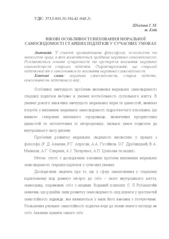 - Шкільна, Ірина Миколаївна (orcid.org/0000-0001-9456-8278) (2014) Аge peculiarities of the education of the moral self-consciousness of older adolescents in modern conditions Наукові записки. Серія "Психолого-педагогічні науки", 5. pp. 63-67.