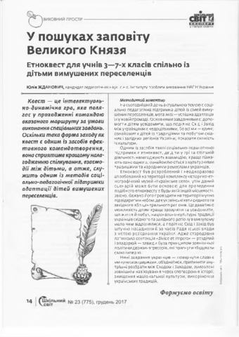 - Жданович, Юлія Миколаївна (orcid.org/0000-0003-1677-189X) (2017) In search of the will of the Grand Duke (Etno Quest for students 3-7 grades together with children of forced migrants) Шкільний Світ, 23 (775). pp. 14-29.