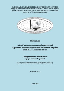 ДНПБ України ім. В. О. Сухомлинського, НАПН України (2018) Materials of the report scientific-practical conference V.O. Sukhomlynskyi state scientific and pedagogical library of Ukraine "Information provision of the sphere of education of Ukraine" . Державна науково-педагогічна бібліотека України ім. В. О. Сухомлинського, м. Київ, Україна.