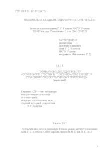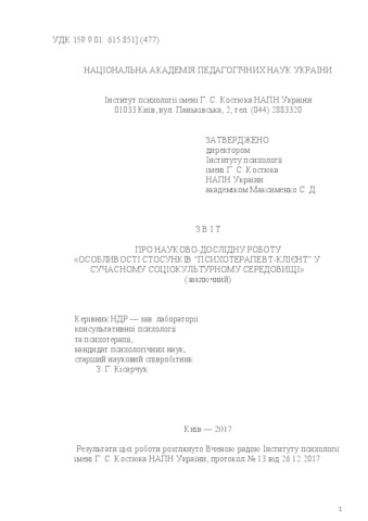 - Кісарчук, Зоя Григорівна (orcid.org/0000-0002-4461-945X), Омельченко, Яніна Миколаївна (orcid.org/0000-0002-3012-2258), Лазос, Гелена Петрівна (orcid.org/0000-0002-8935-2664), Гурлєва, Т.С. (orcid.org/0000-0002-6518-5216), Гребінь, Л.О., Литвиненко, Людмила Іванівна, Журавльова, Н.Ю. (orcid.org/0000-0002-3575-9776), Плескач, Б.В. (orcid.org/0000-0002-2215-6810) and Уркаєв, В.С. (orcid.org/0000-0002-2414-7977) (2017) Report on research work "Peculiarities of «psychotherapist-client» relationship in modern socio-cultural conditions" Technical Report. Інститут психології імені Г. С. Костюка НАПН України, м. Київ, Україна.