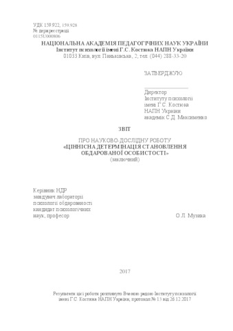 The results of the fundamental scientific research of the value determinants of the formation and development of a gifted person performed by the laboratory of the psychology of giftedness of the G.S. Kostiuk Institute of Psychology of the National Academy of Educational Sciences of Ukraine.