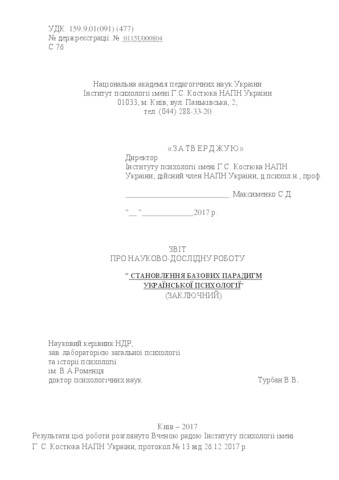 Report on scientific-research work ”the formation of the basic paradigms of the Ukrainian psychology.” The aim of the work is to study the peculiarities of the formation of basic paradigms in Ukrainian psychology. It was planned to investigate the regularities and foundations, psychological content and functional role of psychological paradigms, as well as to reveal their reflection in the Ukrainian psychological thought.