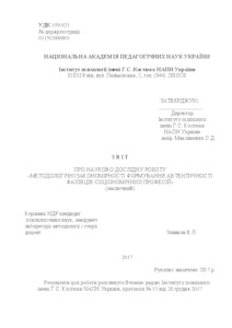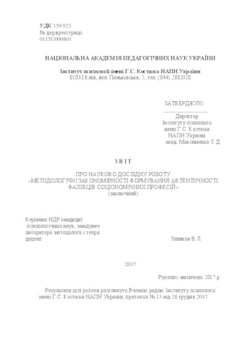 - Зливков, В.Л., Копилов, Сергій Олегович, Лукомська, Світлана Олексіївна, Хомутиннікова, Н.Н. and Котух, О.В. (2017) Report (final) on the research work "Methodological patterns of forming the authenticity of specialists in sociological trades" (state registration number of topic number 0115U000801) Documentation. Інститут психології імені Г.С. Костюка НАПН України, м. Київ, Україна.