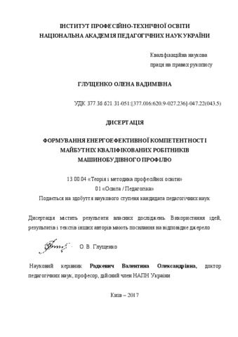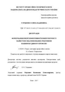 - Глущенко, Олена Вадимівна (orcid.org/0000-0003-0351-4405) (2017) Formation energy-efficient competence for future skilled workers of machine-building profile Doctoral thesis, Інститут професійно-технічної освіт.