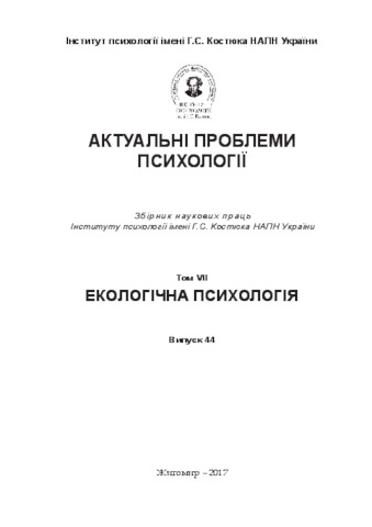 The collection of scientific papers submitted articles scholars, including staff, graduate students and research correspondents environmental psychology laboratory of the G. S. Kostiuk Institute psychology NAPS Ukraine, which highlights the theoretical, methodological and applied problems environmental psychology as a direction research that studies the psychological problems human interaction with the environment her life. Particular attention is paid to psychological problems protecting and preserving the environment. Collection psychological and teachers addressed gies higher educational institutions, graduate students, workers in the field applied psychology, scientists, psychologists and other professionals with problems understanding and interpretation.