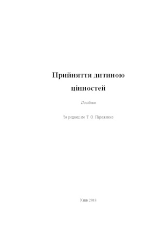 Піроженко, Тамара Олександрівна, Карабаєва, Ірина Іванівна (orcid.org/0000-0003-4286-2103), Ладивір, Світлана Олексіївна, Соловйова, Людмила Іванівна (orcid.org/0000-0003-3584-9779), Токарєва, Людмила Дмитріївна (orcid.org/0000-0002-8162-6544), Федорчук, Олена Іванівна and Хартман, Олена Юріївна (orcid.org/0000-0002-3380-4836) (2018) Adoption by the child of values . Видавничий Дім "Слово", м. Київ, Україна. ISBN 978-966-194-293-5