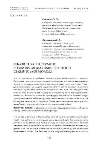 - Остапенко, Ірина Віталіївна (orcid.org/0000-0001-6710-5964) and Соснюк, Олег Петрович (orcid.org/0000-0002-7558-8879) (2018) Web-quest as a tool for the development of media competence of student youth Український психологічний журнал, 1 (7). pp. 133-150. ISSN 2520-6265