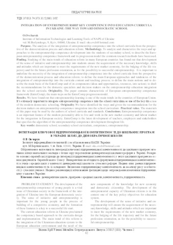 - Овчарук, О.В. (2017) Integration of entrepreneurship key competence into education curricula in Ukraine: the way toward democratic school Вісник Кременчуцького національного університету імені Михайла Остроградського, 2 (2(103)). pp. 82-88. ISSN 2072-8263