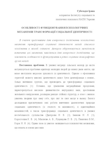 The paper deals with the empirical study of psychological mechanisms of social identity transformation of rural youth in urban community. The author substantiate the methodology of these mechahisms appreciation. The data of empirical research are analyzed that explain the features of their functioning in different social and demograsfic group of youth.