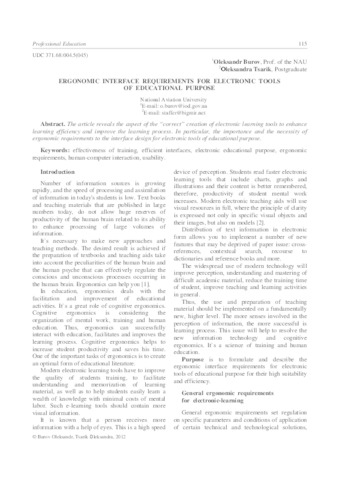 - Burov, O. Yu. (orcid.org/0000-0003-0733-1120) and Tsarik, O. R. (2012) Ergonomic interface requirements for electronic tools of educational purpose Вісник Національного авіаційного університету (2). pp. 115-119. ISSN 1813-1166
