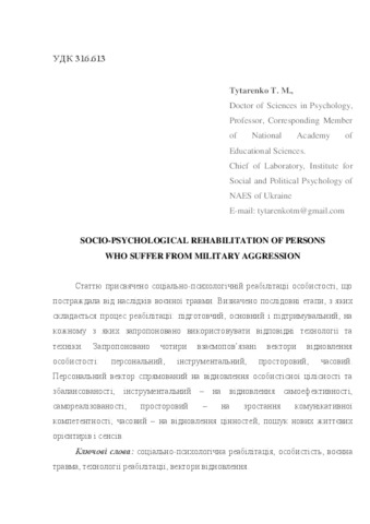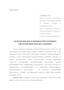| Keywords: | socio-psychological rehabilitation, personality, war trauma, rehabilitation technologies, recovery vectors. |