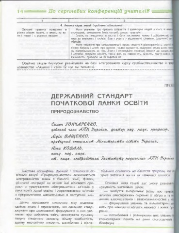 - Гончаренко, Семен Устимович, Ващенко, Л.С. and Коваль, Ніна Степанівна (1997) State standard of initial education. Natural science Початкова школа, 7. pp. 14-17.
