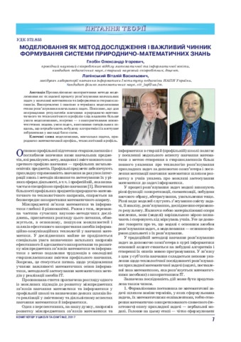 - Лапінський, В.В. (orcid.org/0000-0002-2832-4774) and Глобін, Олександр Ігорович (2017) Modeling as a Research Method and an Important Factor in the System of Natural-Mathematical Knowledge Formation Комп’ютер у школі та сім’ї, 2 (138). pp. 7-10. ISSN 2307-9851