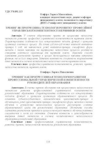 - Оліфіра, Л.М. (orcid.org/0000-0002-9534-1451) (2014) Training as advanced technology of development of professional management competence of the managers of education Bulletin of postgrated education, 12 (25). pp. 116-127. ISSN 2218-7650