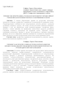 The training as a progressive educational technology for the development of professional competence of managers of education is substantiated in the article. Conceptual approaches, features, functions and principles of the educational process are determined. On the basis of subject-subject interaction of teacher-coach and those who study, roles of teacher-coach, specific forms, methods and techniques of learning and managing of teaching process the creating of a learning environment for educational managers is considered. The ways of evaluating the results of training in the direct training of these professionals at the end of training and postponed are highlighted. The importance and feasibility of the introduction of this technology in postgraduate education system of educational managers specified.