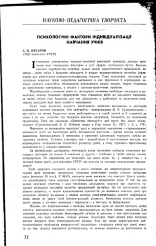 - Мусатов, Сергій Олександрович (1983) Psychological factors of individualization of student learning Початкова школа, 3 (165). pp. 72-76.
